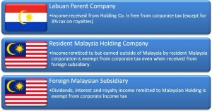 - No Resident Malaysia Holding Company: If the foreign subsidiary was owned directly by the Labuan Parent Company (no Resident Holding Company used), then withholding taxes of 25% would be levied on dividends, royalties, and interest. This is because Labuan, as an offshore territory, probably will not be considered part of Malaysia for double taxation treaty purposes. In otherwords, a Resident Malaysia Holding Company should be used to ensure the double tax treaty protection. The double tax treaty is the only way to reduce withholding taxes that flow from the foreign subsidiary.